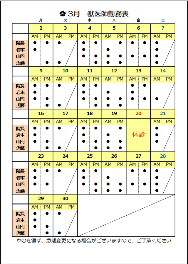 お知らせ 獣医師出勤表~3月~ 3月14日(土)は、院長と岩本先生、近藤先生が不在で、診察は山内先生のみになります。 なお、犬猫のみの診察になります。 また、ご予約はお取りできません。 混み合うことが予想されますので、時間に余裕をもってお越しください。 ご迷惑をお掛けしますが、よろしくお願い致します。
